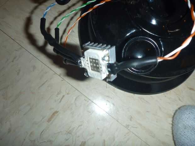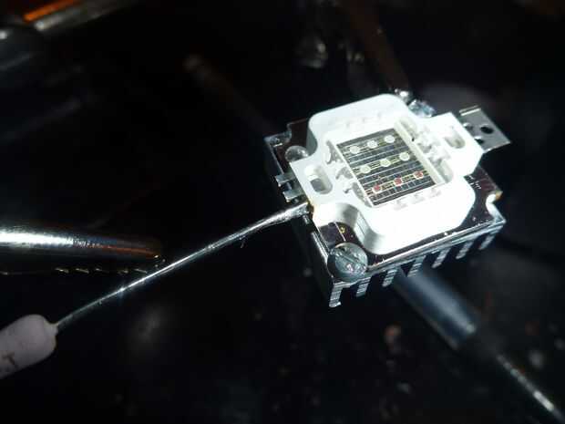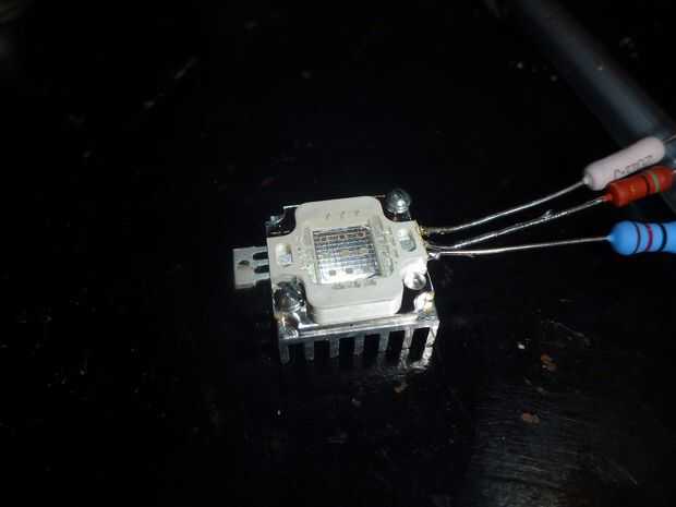 Las 3 resistencias limitante actual de 2W en el LED (20 ohmios a rojo 15 ohm a verde y 12 ohmios al azul) de la soldadura