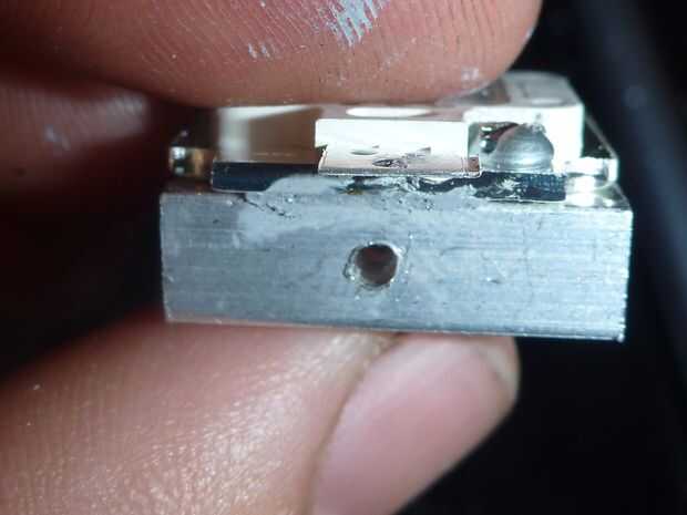 Marque y perfore el disipador de calor con una 1/16 broca para montar el LED. También Perfore un orificio de 1/16" a través de las aletas. Este agujero se utilizará posteriormente para montar el LED de la linterna.