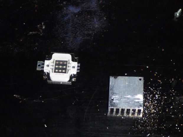 Poner un poco de pasta térmica en el disipador de calor y utilice los tornillos de metal de hoja (#2 x 1/4") para montar el LED del disipador de calor.