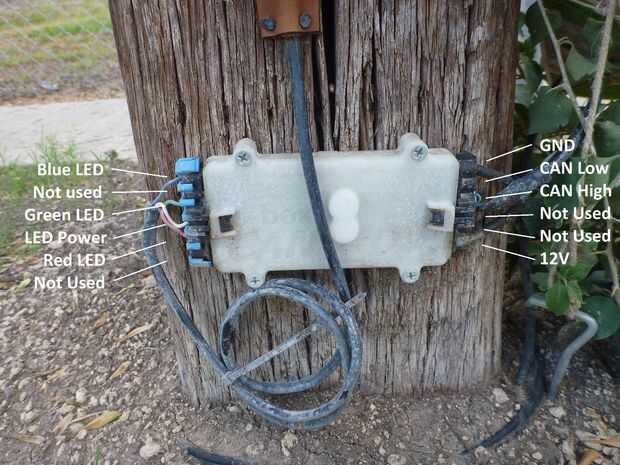 El cableado en la caja es simple: 12v, tierra y la lata alta / baja los cables van a la derecha. Y encendido, rojo, verde, azul hacia fuera el conector izquierdo.