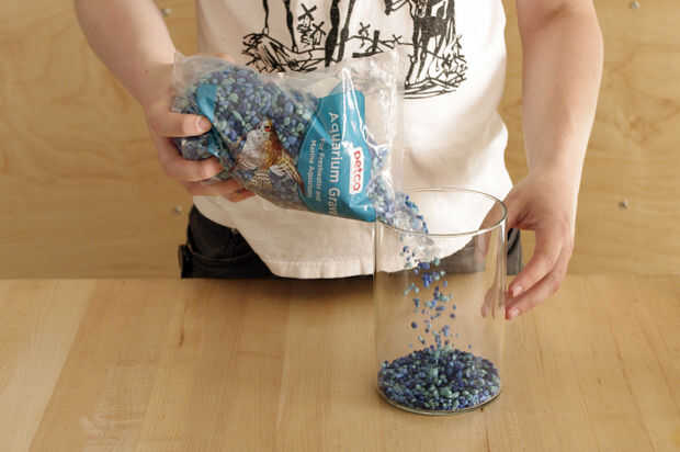 Vierta la grava en el fondo de la vasija de tamaño mediano del conjunto.