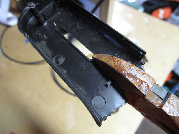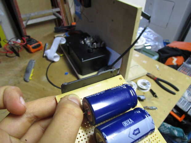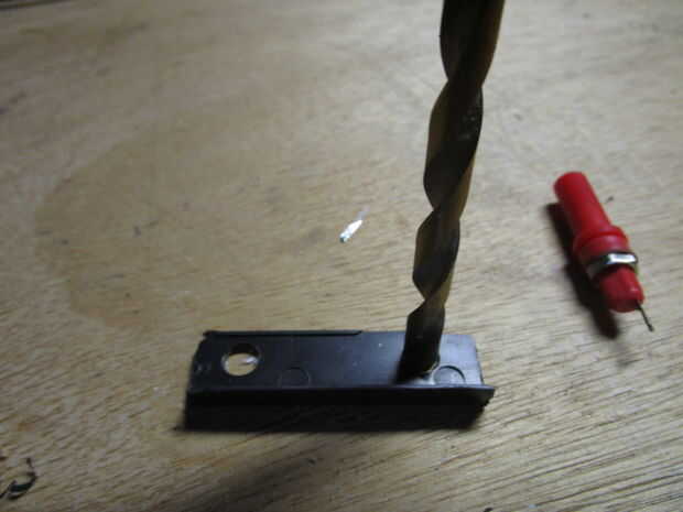 Corte un pedazo de plástico grueso sobre la anchura de la Junta de perf. Doblar el plástico 90% por lo que se puede pegar sobre el borde de la Junta de perf. Sostenga la pieza en el tablero de perf como se muestra arriba y marque dos puntos en el plástico de la pieza las líneas hacia arriba con los conductores en los condensadores. Utilizar una pistola para perforar dos agujeros en los puntos que usted hizo. Los conectores de tipo banana hembra deben ser capaces de encajar en los agujeros.