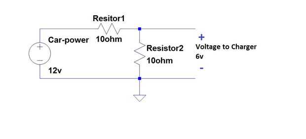 divisor de tensión. Si nos fijamos en el cuadro 3 se puede ver cómo montarlo. Básicamente hay 2 resistencias en serie conectada a la energía del coche. Luego usted simple toque el USB + wire(red) entre las resistencias y la - wire(black) a-del coche. Es clave que se utilizan 2 de las resistencias mismas. Esto será la mitad el voltaje de 12v a 6v, que es seguro para el cargador.