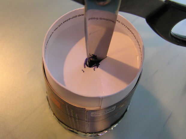 Una vez que el interior está recubierto en papel aluminio, hacer un agujero en la parte inferior de la taza en la marca que hicimos más ealier. Hacerlo desde la parte posterior de la taza (para que pueda ver la marca).