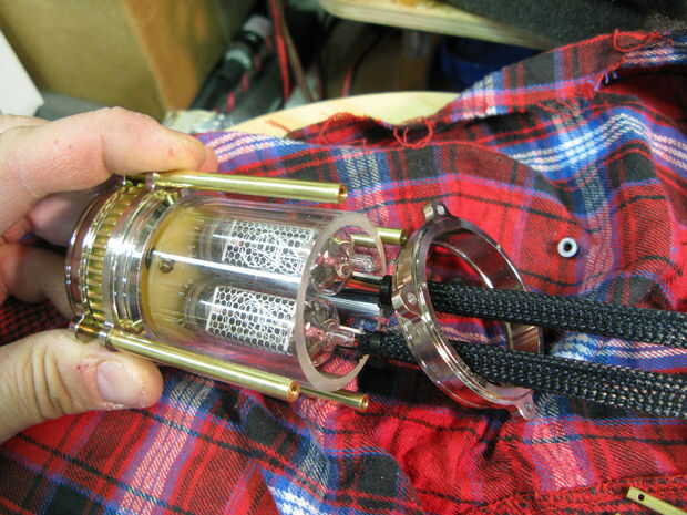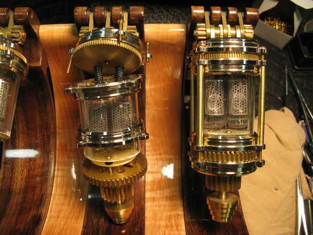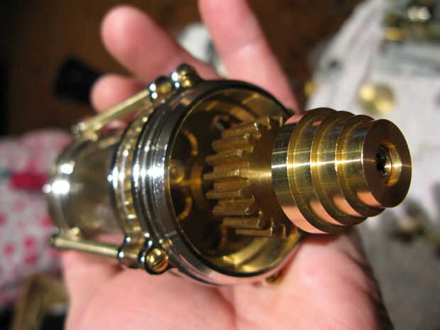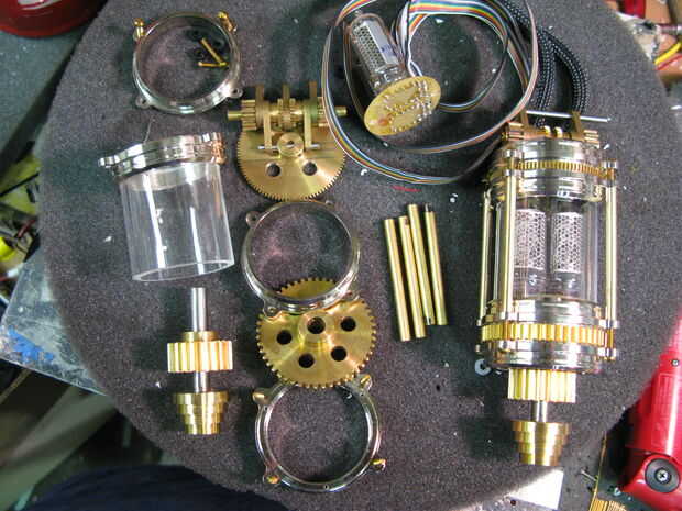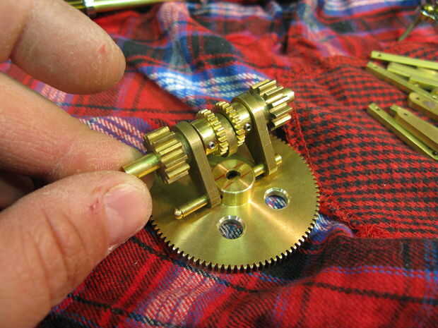 el eje del engranaje más fino fue transversal perforado y un eje de acero fue introducido como el pivote de oscilación (Foto 2), lo mismo se hizo en el accesorio anterior usando un surtido de engranajes y separadores, una funda protectora de alambre tejido fue utilizada para ocultar el mazo de cables de cinta de 24 conductor.