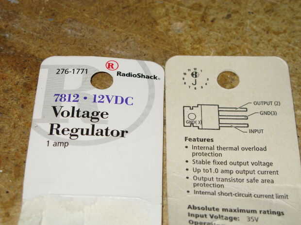 Aquí es el embalaje para el regulador 7812 que compré en Radio Shack por aproximadamente $2.00. Asegúrese de que usted preste atención a los puntos de conexión como se muestra en la parte posterior del paquete.