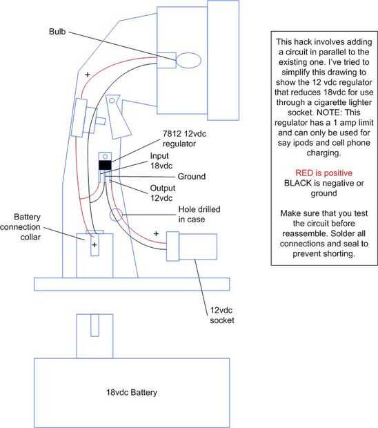 Aquí es un dibujo que hice para tratar de explicar el circuito. Se agrega como una paralela y utiliza el regulador para reducir la tensión de 18vdc a 12 VCC. Espero averiguar todas las partes de la luz.