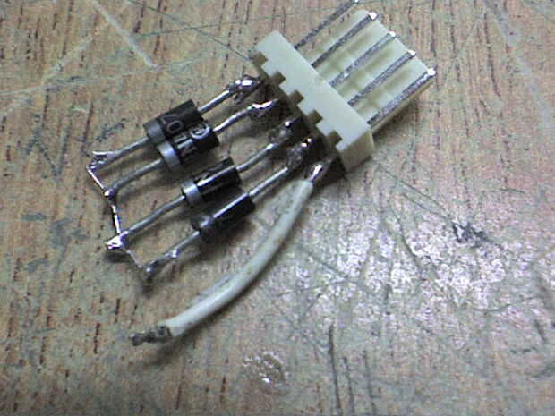 Los cuatro diodos a los contactos de las bobinas individuales del motor en el conector macho y un pequeño trozo de alambre al cable que se conecta el común de las cuatro bobinas del perno de la soldadura.