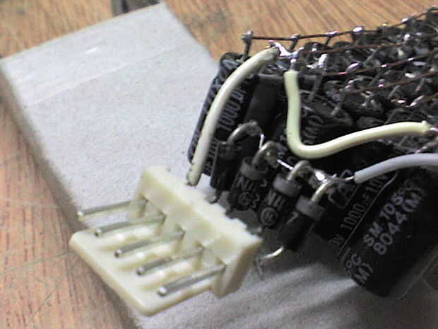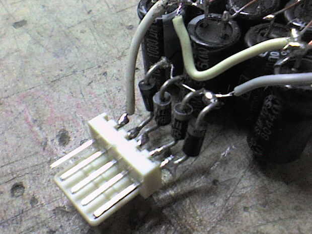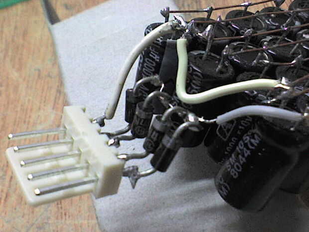 La salida de los cuatro diodos para el positivo de los condensadores y el cable al negativo de la soldadura.