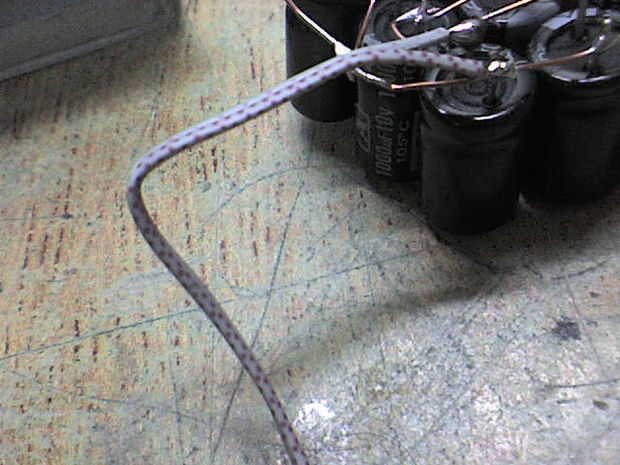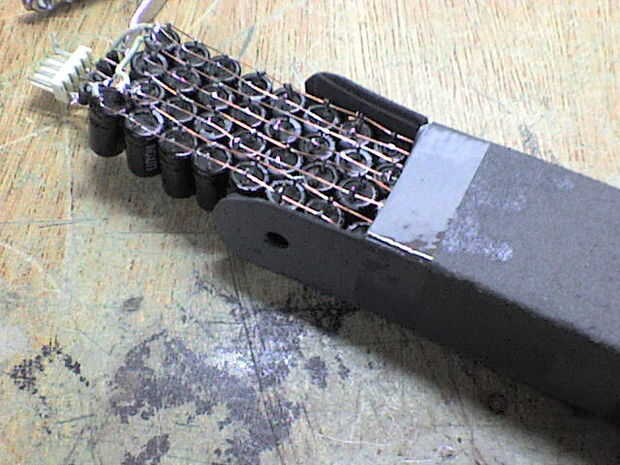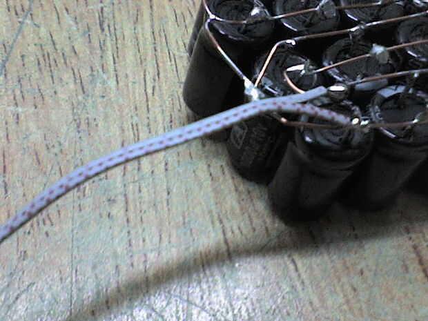 La soldadura de dos piezas de alambre en el lado opuesto de los condensadores.