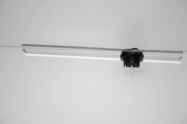 Corte un trozo de plástico de 7 pulgadas por 1 1/4 pulgadas. Perfore un agujero de 3/4 pulgadas 2 1/4 pulgadas desde el extremo. Este es el interruptor de plástico. Presione el interruptor de encendido/apagado a través del agujero y asegure roscando tuerca plástica del interruptor.