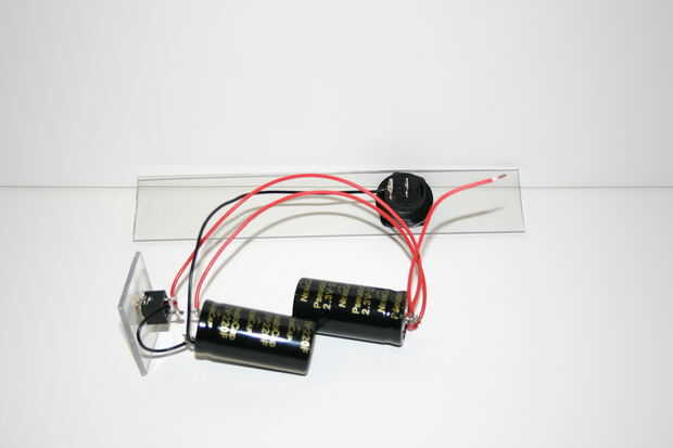 De la soldadura de uno de los extremos de una longitud de 6 pulgadas de cable negro a uno de los extremos del condensador (-). Suelde el otro extremo al interruptor de encendido/apagado.