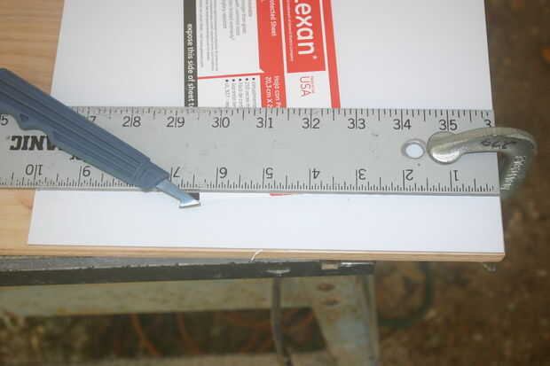 a continuación cortar la lámina de plástico de 1/8 de pulgada para el caso de la linterna. Generalmente, esto se logra marcar el plástico, y luego romper líneas anotadas. Pero en primer lugar, el plástico de la marca con un marcador, entonces utilice la abrazadera C para mantener un borde recto metálico junto a la marca. Entonces utilice la punta de un cuchillo puntuación (generalmente vendido junto a las hojas de plástico) para crear un fino surco en el plástico a lo largo de la línea que marcó.