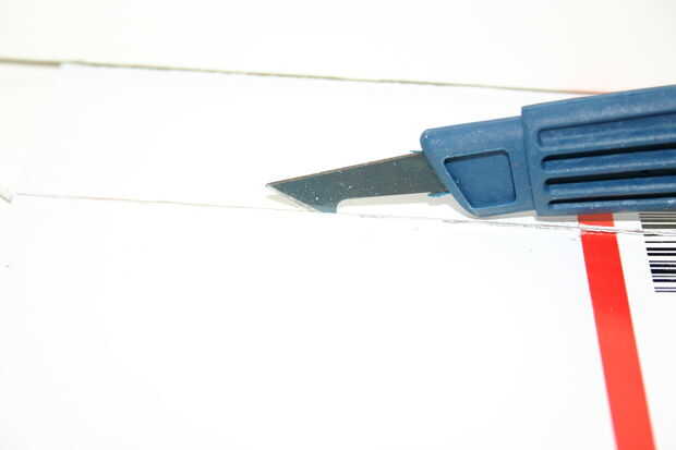 Utilizando el borde de puntuación (no la punta del cuchillo) tire el cuchillo a lo largo de la línea fina varias veces hasta que cree una ranura. Ahora puede trabarse el plástico a lo largo de la línea. Practique este método varias veces hasta que domines la técnica.
