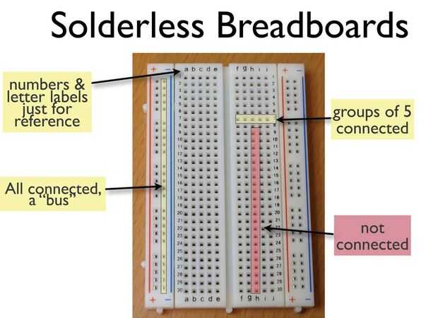 Breadboards trabajan por conectar componentes que están al lado juntos. Dentro de cada protoboard son tiras largas paralelas de cobre. Si conecta cinco elementos juntos en la fila 1, el mismo sería como si se les sueldan todos juntos. Todos los agujeros en la fila 1 son independientes de todos los pernos en la fila 2 y así sucesivamente.