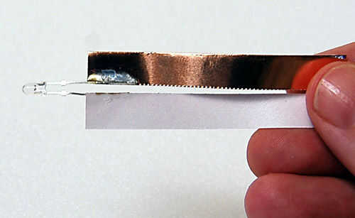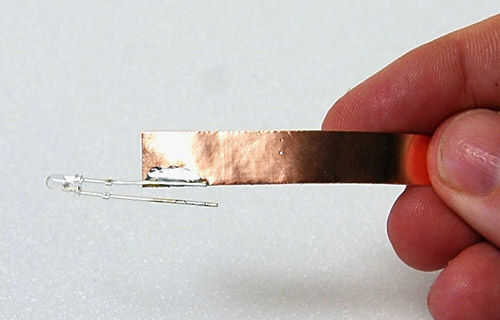 Cortar un par de tiras de cinta de cobre de 1/4 pulgada de ancho y 2 1/2 pulgadas de largo. Soldar un extremo del LED a una de las tiras de cobre, a partir de a medio camino el plomo del LED. Hacer la conexión para que la soldadura es cerca del borde de la tira de cobre y no utiliza demasiado calor, o los autoadhesivos papel del forro se despelleja. Entonces voltee el LED y lo mismo en el otro lado.