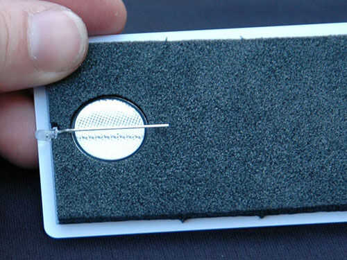 Ahora empuje una pierna por debajo de la celda (irá entre la tarjeta y espuma), y la otra pierna debe ir por encima de la celda.