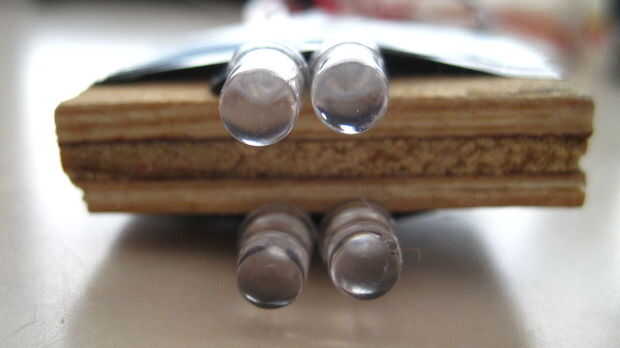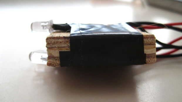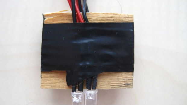 Para mantener los LEDs en su lugar, usaba un pequeño rasguño de madera que encajan perfectamente dentro de la vivienda.  Posición de los LEDs lo más cerca posible uno al otro para hacer la luz más concentrada.  Envuelva el bloque de cinta aislante para sujetar firmemente los LEDs en.