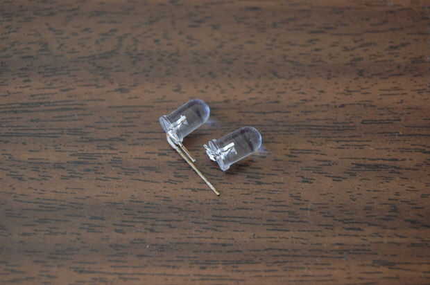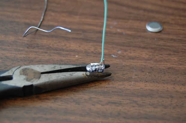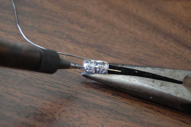 1 - comenzar con los LEDs. Primer uso de las pilas de botón para probar los LEDs para asegurarse de que no están muertos antes de empezar. Corta las puntas por lo que puede soldar juntos en paralelo. Asegúrese de tener en cuenta la polaridad de los LEDs para soldar uno de ellos hacia atrás hará que no funcione. Recuerde que el lado plano del LED es el lado del cátodo (negativo). Esto es donde este proyecto complicado. Estas pequeñas piezas de soldadura sin darse quemaduras de 2 º grado requiere una mano firme. Debo han tenido un poco menos café el día que este había soldado arriba pero tengo que funcione finalmente.
