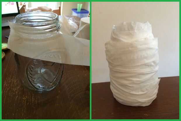 • Tomar una tira de papel, pegarlo a la cinta y empezar a envolver el frasco. Repita este proceso hasta que la jarra entera está cubierta de papel.