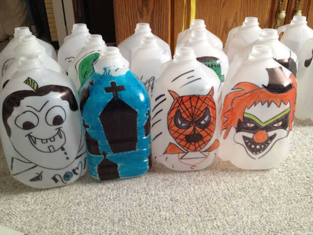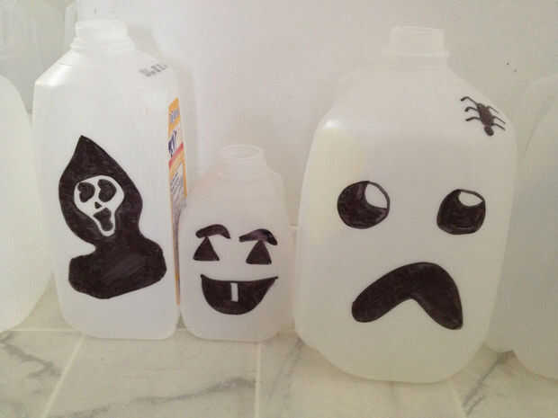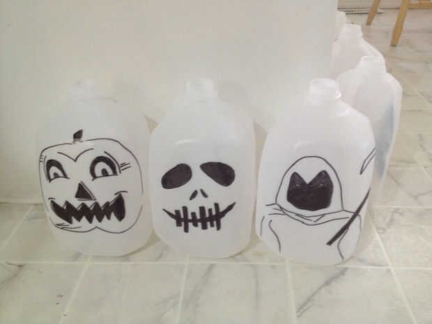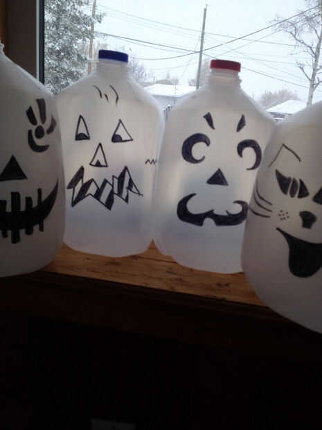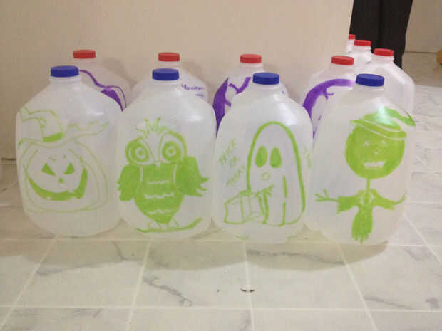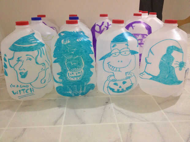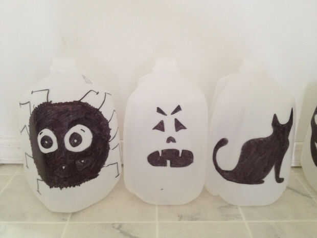 Puede caer cada luz en la parte superior de las jarras de leche o puede hacer un agujero en la parte inferior de cada jarra de leche y empujar en las luces de la araña.
