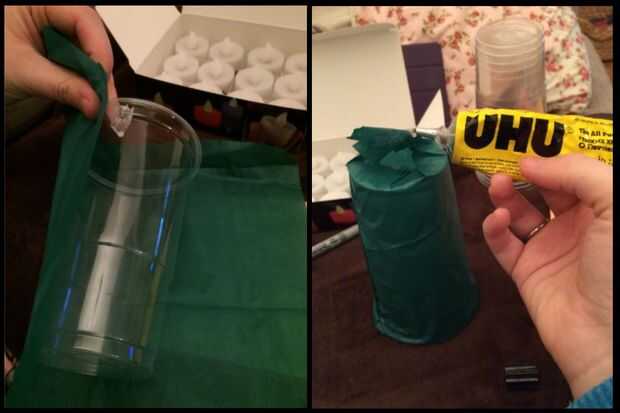 • Poner un trozo pequeño de cinta de doble cara (o una cucharada de pegamento) en la parte superior e inferior de la Copa y pega el papel hacia abajo.