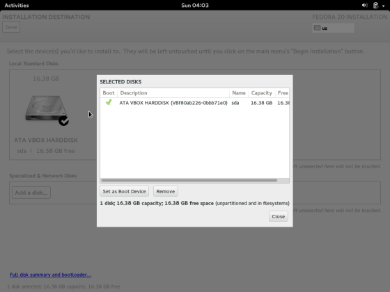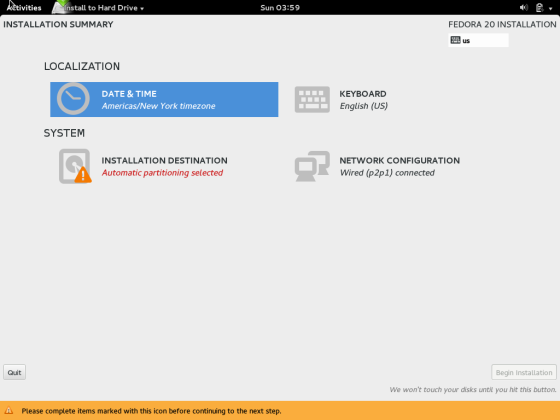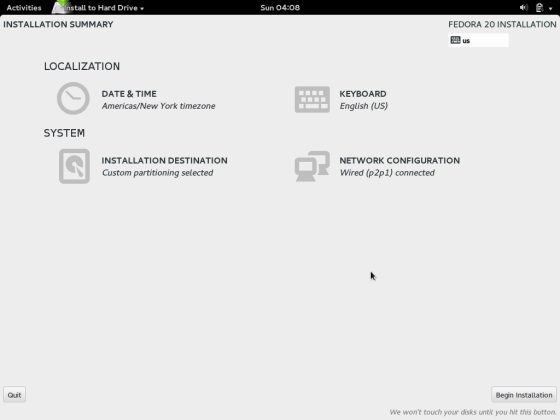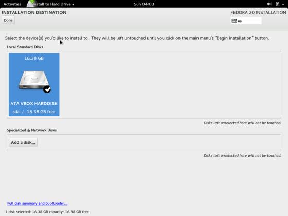 2.3 iniciar Fedora 20 instalación haga clic en instalar en disco duro