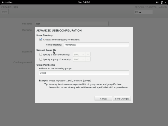 Fedora 20 cuenta de usuario avanzada pantalla de opciones.