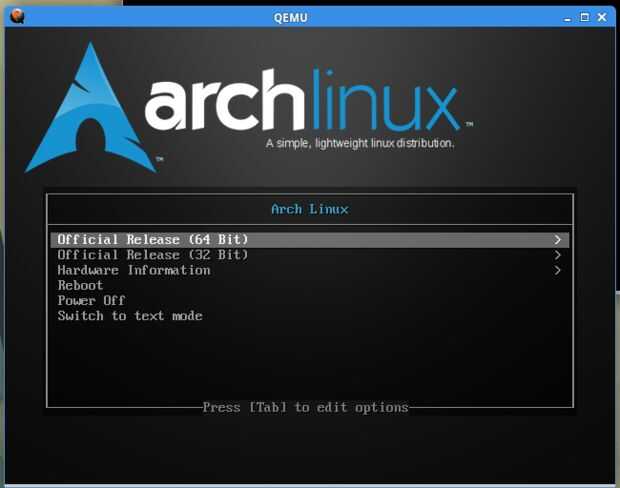 El entorno de arranque de red de Arch Linux permite arrancar Arch Linux live media directamente sobre la red. Se inicia en un menú donde puede elegir de una lista de espejos disponibles. La imagen se descargará en la memoria.