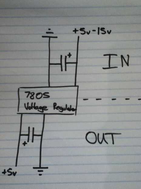 Mi plan original era imprimir mi propio PCB y usar eso pero después de dos fallaron intentos de di para arriba y simplemente construir una versión más simple en Veriboard. Una vez que estaba completamente frustrado de mi centésimo intento imprimir mi propia falta de PCB, redacté un esquema de un circuito regulador voltaje muy simplemente. Los condensadores no son estrictamente necesarios como este no es rectificar AC pero no duele ponerlos en.