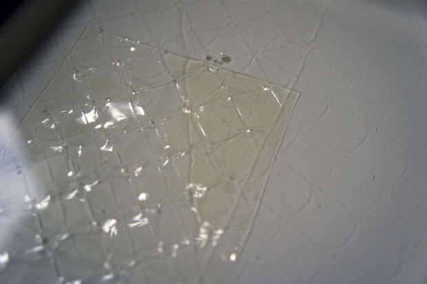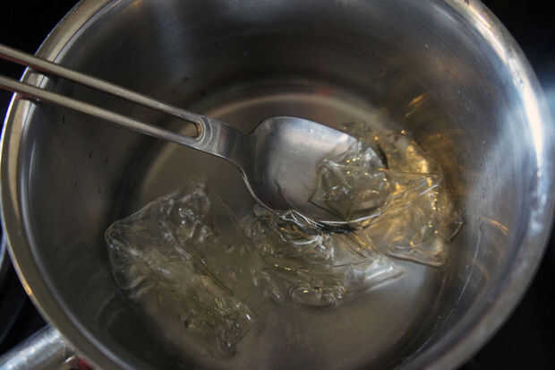 Primero Haz la gelatina como se indica en el envase. Para un cristal necesita una o dos hojas de gelatina. Remoje en agua, luego calentar las hojas con agua 5 cucharas en un recipiente y mezcla hasta que quede una jalea suave.
