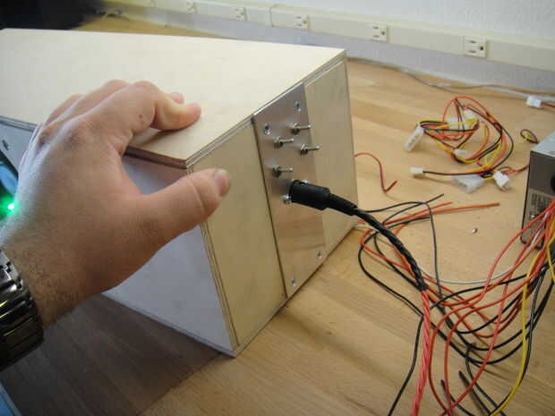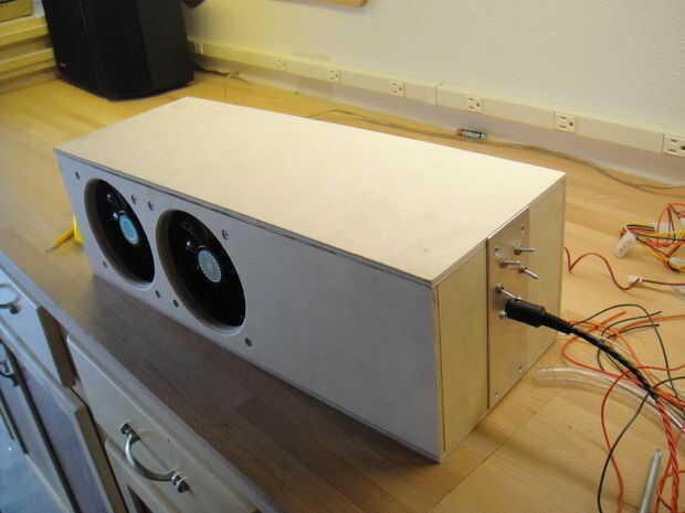 Desea construir un bonito panel para los interruptores de luces, interruptores de control de ventilador, conectores de alimentación etc.. Esto hace más fácil instalar interruptores y cosas como 1/2 capa es demasiado gruesa para montar estas cosas en. Alambré mis interruptores que hace que los dos mejores cada lado o apagado completamente, y la parte inferior dos entre el completos 12 voltios y 7 voltios. 7v los fans son casi silenciosos, pero aún empuje adecuado de aire. A 12v son todavía a muy fuertes, pero empujar mucho más aire por el radiador. He hecho esto de la misma manera como el llamado "7 voltios mod" que se discute en otra parte en internet. Cuando el interruptor está en modo normal el + cable del ventilador es de 12v y el - lado obtiene tierra o 0v. en la posición de 7v, el + lado todavía tiene 12v pero - lado obtiene 5v, para una diferencia de voltaje de 7 voltios. El conector de alimentación es una que encontré en el lugar de la electrónica local y se conecta a un conector molex de 4 pines en la computadora que está enfriando. lleva 12 voltios, 5 voltios los carriles de tierra de la fuente de alimentación a la caja externa.