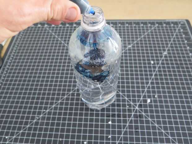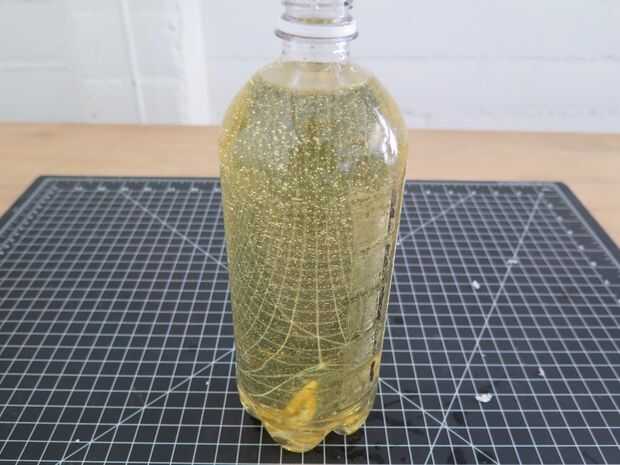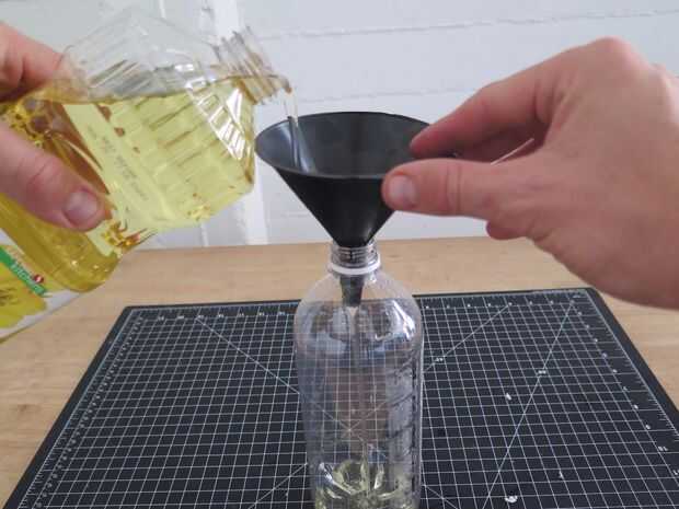 Llene la otra botella con aceite con un embudo en la parte superior también. Compruebe hacia fuera las burbujas dentro. Son fascinantes.