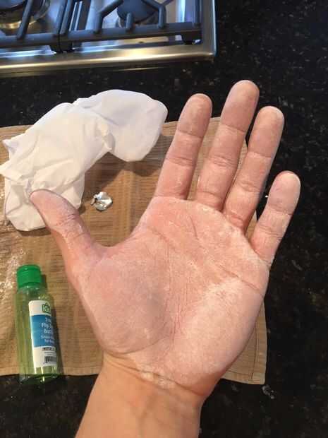 Vierta una cantidad de níquel tamaño de líquido y frotar entre las manos. Las manos hacia adelante y hacia atrás para facilitar el proceso de secado de la onda. Cuando se seca, tienes una buena capa de tiza en las manos.