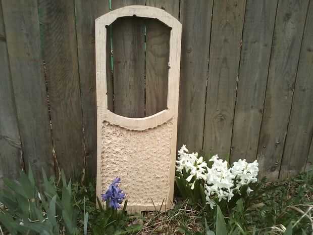 Utilizando las líneas de lápiz enunciadas el paso uno como referencia, taladre agujeros de seis o más usando una broca normal de su elección. Perforar una al lado de cada una de las esquinas, pero no en las líneas de lápiz Luego perforar uno en el vértice de la parábola superior y en el fondo, otra vez junto a pero no en las líneas de lápiz. Usar la sierra caladora para cortar la madera. Más que seguir las líneas, menos madera tienes que tallar la arena.