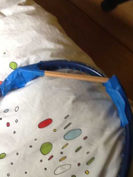 Encontrar un lugar agradable donde el lápiz descansar de un lado de la raqueta a otro. Asegúrese de que hay un montón de agujeros que pueden ir sobre él. (Tenía cerca de 7, usted debe tener por lo menos cuatro)