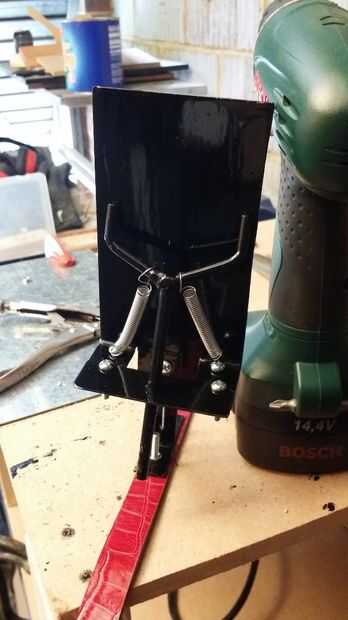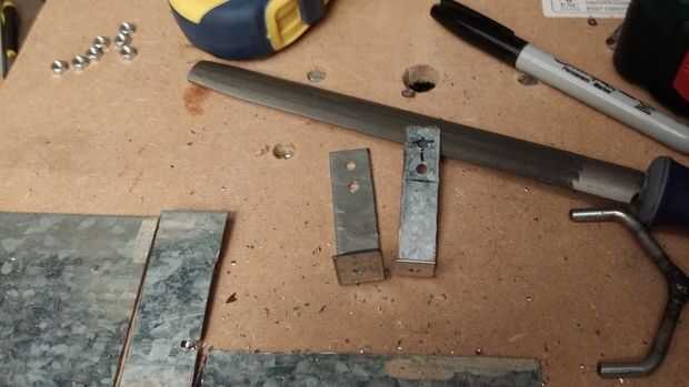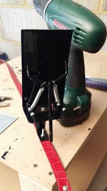 Corté dos tiras del mismo acero 1mm que solía hacer el cuerpo, siendo 3,5" de largo y aproximadamente 0,75" de ancho. Había marcado un frente y un reverso en cada uno y una sección de 1" en la parte superior e inferior. La sección superior se superpondría el cuerpo principal y se usa para fijar los dos junto con un par de tornillos. Doblar la sección inferior de la mordaza de mesa, 1 adelante y 1 atrás. Esto entonces puede empernarse a una correa de cuero que es cómo se une la lira al brazo del usuario. Las 2 columnas están dobladas en direcciones opuestas proporciona soporte y detiene la lira de inclinarse hacia atrás o remite al ser.