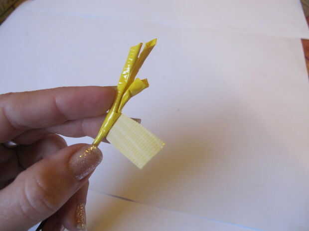 Tome las dos tiras amarillo (con los extremos acentuados, doblados) y envuélvalos alrededor de sí mismos, a la flor (que sujete más tarde, con la que tira al azar de amarillo a la izquierda). Con al azar 4 franja de cinta amarilla, coloque los dos pistilos en el pistilo anclado a la madre de alambre. Ahora tienes el centro de tu flor!