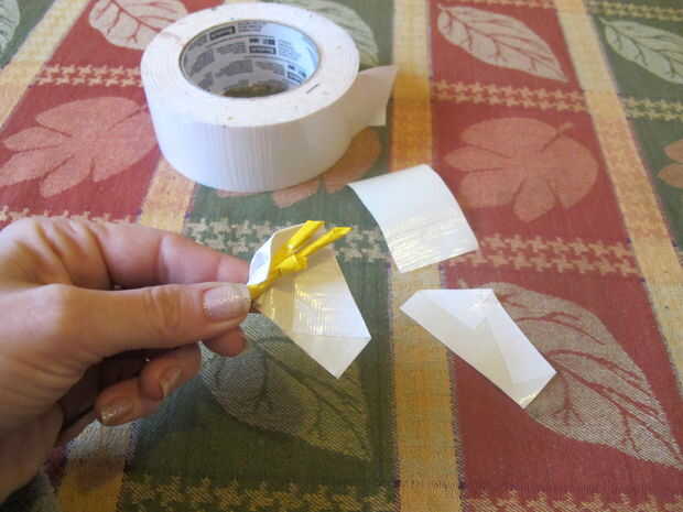 Ahora es el momento para hacer los pétalos blancos. Cortar una tira de 3" de cinta aislante blanca. Dobla las esquinas a lo largo para hacer un punto de ancho. Asegúrese de dejar suficiente cinta expuesto en la parte inferior para unir los pétalos al tallo. Me gustaria hacer varios pétalos a la vez para que puedo poner varios en una fila.