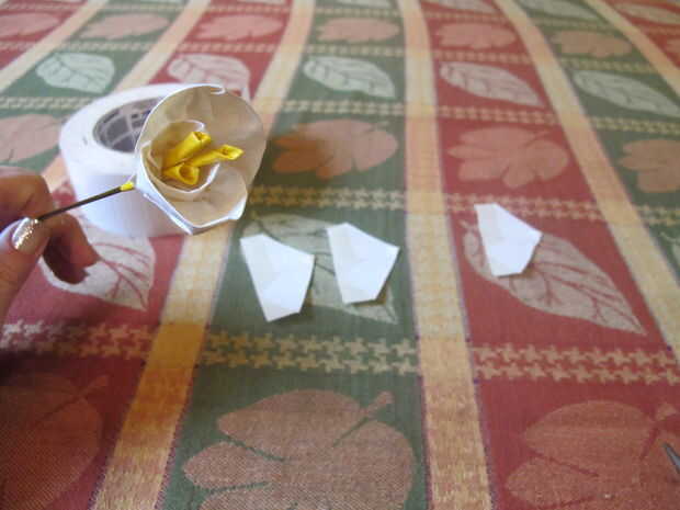 Usando la cinta adhesiva expuesta, pegue los pétalos al tallo, sosteniéndolo en un ángulo. Recoger un poco la cinta que se envuelva alrededor del tallo para que está un poco flojo y el pétalo está parado para arriba y hacia fuera. Repita este proceso varias veces con 4-5 pétalos más. Puede escalonar sus pétalos hasta alrededor en la parte trasera para hacer un más "lirio" como arreglo de pétalos.  Una vez haya agregado todos los pétalos, tapar el fruncido en la parte trasera de la flor con unas tiras de blanco corte super delgado.