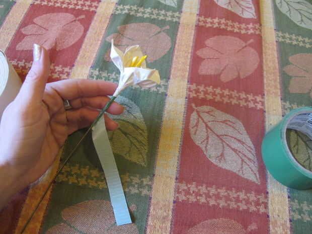 Ahora que se hacen todos sus pétalos, desea hacer su tallo verde envolviendo en tiras delgadas de cinta verde.