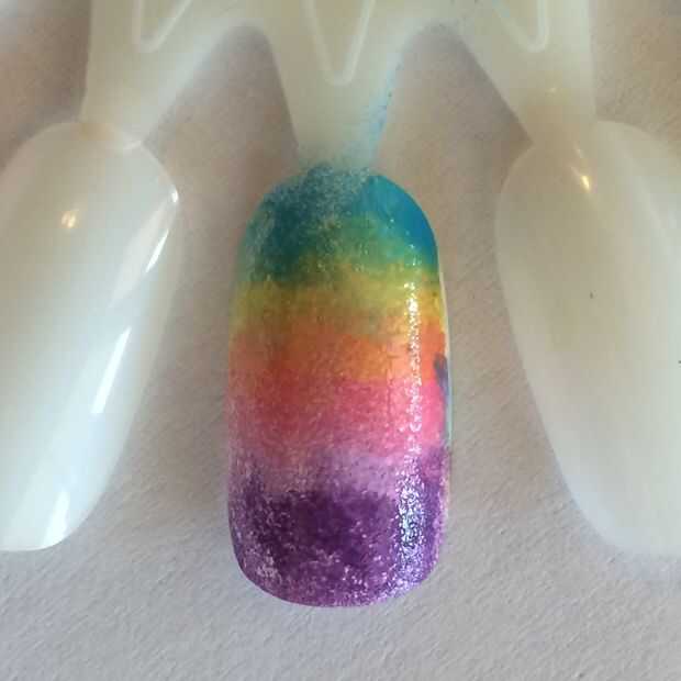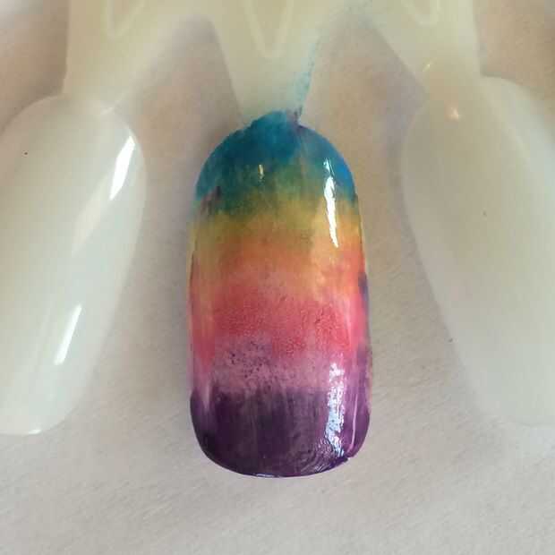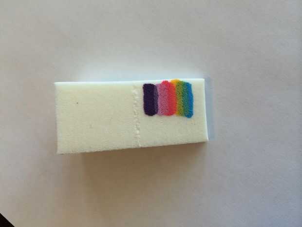 Usando una esponja de maquillaje y generosas cantidades de esmalte, pintar franjas de los colores que desea utilizar en su gradiente, superposición de los colores un poco. Fui para el gradiente completo, usando el color púrpura oscuro, luz púrpura, rosa, amarillo, menta y azul. El truco para conseguir un buen sello fuera de la misma es para asegurarse de que usted pintar amplia suficientes tiras de esponja (en cuanto a cubrir el ancho completo de la uña) y no presione mucho cuando usted estampe su clavo. Sólo desea utilizar una ligera cantidad de presión. Esto permite que el pulimento grueso transferir a su clavo frente a absorber más en la esponja.