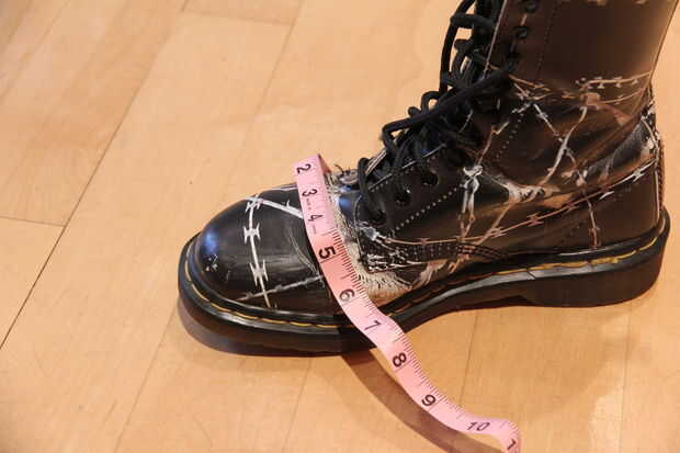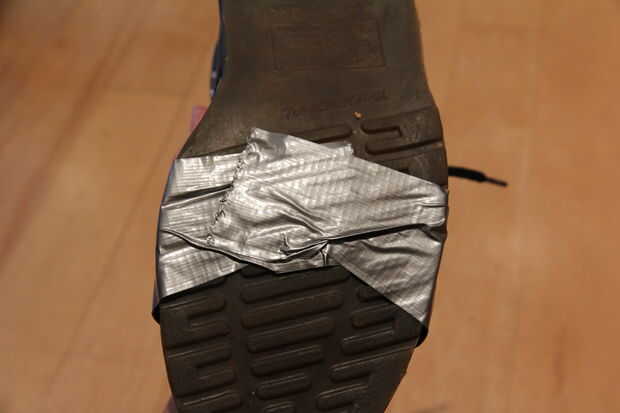 Para conseguir este look para sus botas sin dejar permanentemente mugre de cinta del conducto en, en primer lugar medir una pieza de cinta que es suficiente para envolver alrededor del dedo del pie (parte superior e inferior). Pone este plana en el piso con el lado adhesivo hacia arriba. Medir el otro pedazo de cinta adhesiva justo el tiempo suficiente para envolver en la parte superior del dedo del pie. Puesto esta pieza más corta, el lado pegajoso hacia abajo, encima de uno más largo. Tomar todo y enróllelo alrededor del dedo del pie para que las partes sólo pegajosas se adhieren a la parte inferior de la bota, no a la piel en la parte superior.