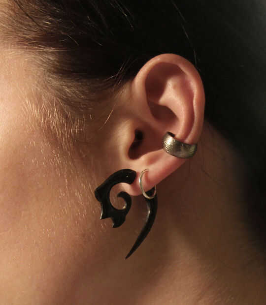 Otro de adornos faciales más prominentes de Lisbeth es sus pendientes calibradas. Hay un montón de opciones que hay para las personas cuyos oídos no calibradas, tengo tanto mi pares de pendientes de falso medidor en Etsy.