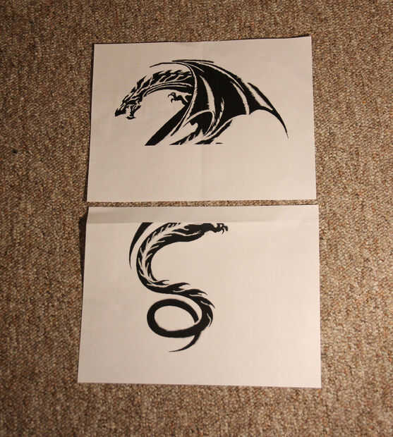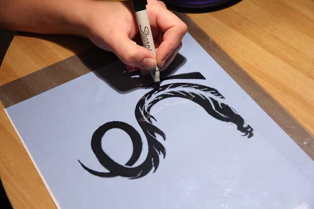 Sobre la imagen y trace con un rotulador sobre el plástico con cinta adhesiva la hoja de plantilla. Opté por dividir aún más la parte superior en dos partes para que la plantilla podría poner el plano sobre la curva de mi espalda.