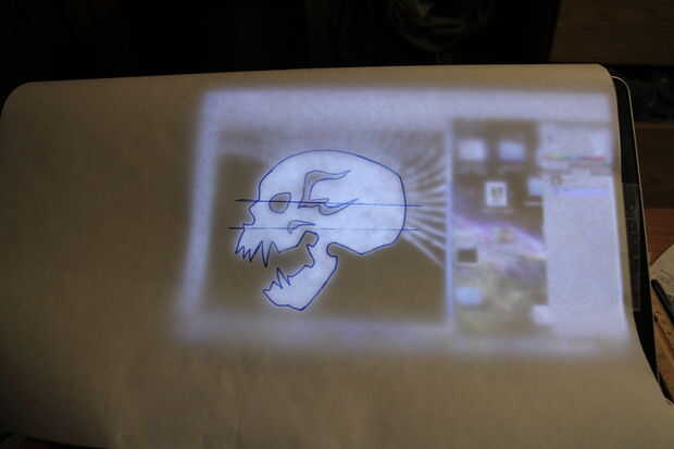 Trazar la parte de la cabeza, cráneo del diseño sobre el lado mate (no encerado) de su papel de congelador impresión hacia fuera en el papel blanco normal entonces grabar a una ventana con el papel de congelador sobre él, grabar el papel de congelador sobre la pantalla del ordenador o usando una caja de luz.