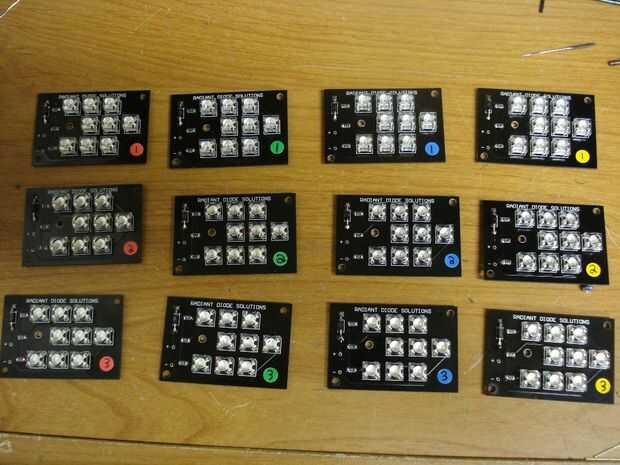 Los LEDs que estoy usando son un poco especiales. Un proyecto más viejo mío estaba construyendo LED luces interiores de mi coche. Estoy usando LED de super flujo 5mm y hasta había PCB personalizado crearon para ellos. Especial ordené algunos LEDs verdes y amarillos para este proyecto y soldado hasta todas las tablas luz que necesitaba.