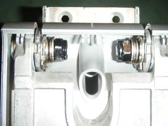 Con se pueden ver los tornillos de la bisagra, elegir uno y retroceda la tuerca, retire las arandelas espaciadoras y fricción, entonces Retire la arandela de siguiente y dale la vuelta. Este es el limitador de oscilación, con que volcó la espiga en no la parada. Poner las arandelas que quitó a y la tuerca.