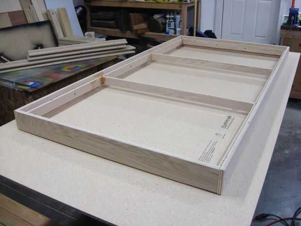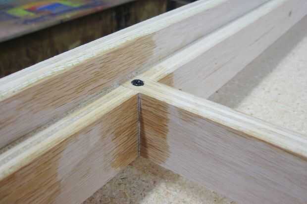 Pegamento de madera se aplican a todas las superficies de acoplamiento e instalar un solo tornillo en un agujero previamente taladrado y avellanado como se muestra.