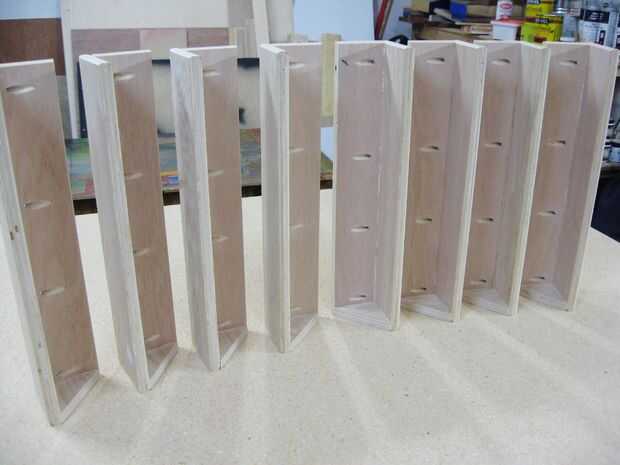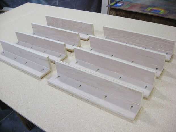 Las piezas de triángulo cortadas anteriormente se sujetan al ras al interior parte inferior de los ensambles de las patas usando clavos de pistola pegamento y clavo. Nota que para uniformidad en los marcos de la cama montada, es necesario fijar los triángulos en lugar tan dos conjuntos de cuatro piernas reflejada por el espejo se crean asambleas (ver foto 1 arriba).